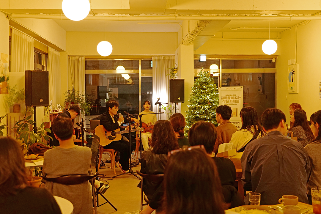컬렉션 버스킹의 묘미, 타이니 콘서트! 11월 8일에는 하루 종일 ‘골목도서관 콘서트’를 열었습니다. 낮에는 가게와 가게를 연결하는 콜라보 프로그램으로 반려동물 목욕샵 도글도글에 AP동물병원 박민호 원장이 출동해 〈반려동물과 함께 살기〉토크를 진행했어요. 저녁에는 브런치카페 윌로우테이블에 뮤지션 권나무를 초대해 타이니 콘서트 〈Under the Tree Trees 세 나무 아래에서〉를 열기도 했습니다. |